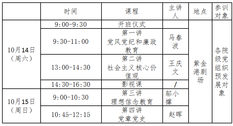 根据党校的工作计划和要求,紫金港校区、西溪校区党校2017年第二期学生发展对象培训班将于2017年10月14日开班。开班仪式和学校层面的辅导报告安排如下: