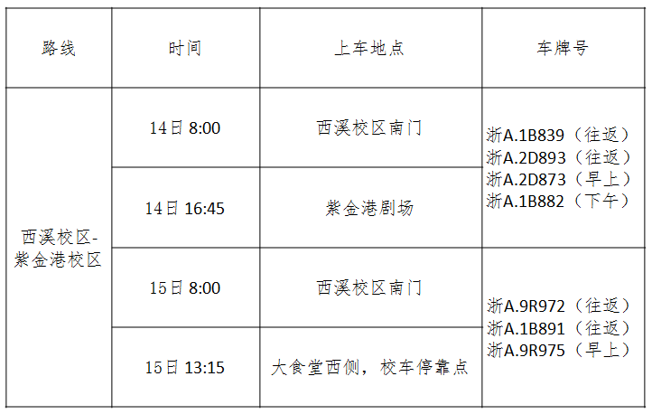 1.安排西溪校区学员搭乘校车往返西溪校区参加培训,校车信息见下表。