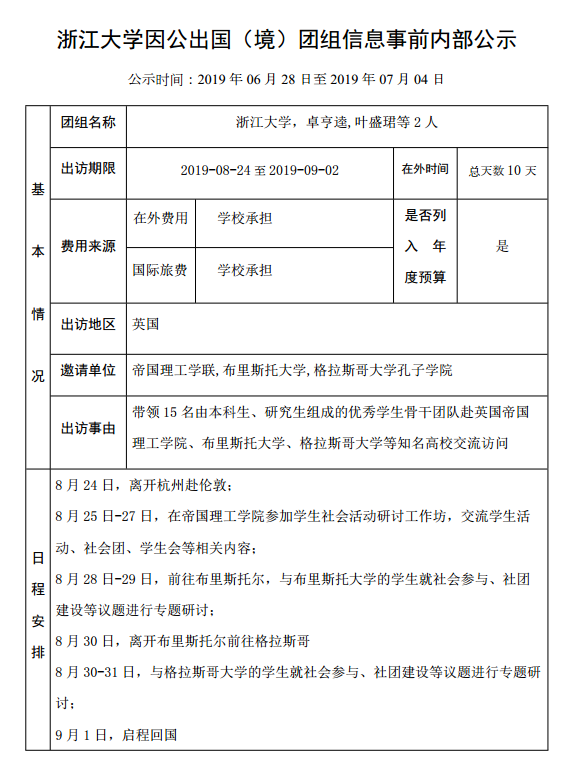 浙江大学因公出国(境)团组信息事前内部公示(五)