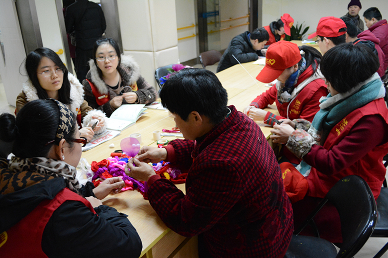 “这个花要这样子做的,我可以做给你看的。”一位志愿者陪着工疗站大妈,手把手一起制作丝网花手工艺品,两位忘年交相谈甚欢,脸上都绽放着笑容,桌子上花瓶里插的是他们一起做好的丝网花。小小的一间活动室里,志愿者们陪大妈做手工,和大爷下象棋,教残障者写书法……这些身穿红色马甲的志愿者是来自浙江大学生仪学院的学生,这已是他们在古荡工疗站开展志愿服务活动的第三年了。