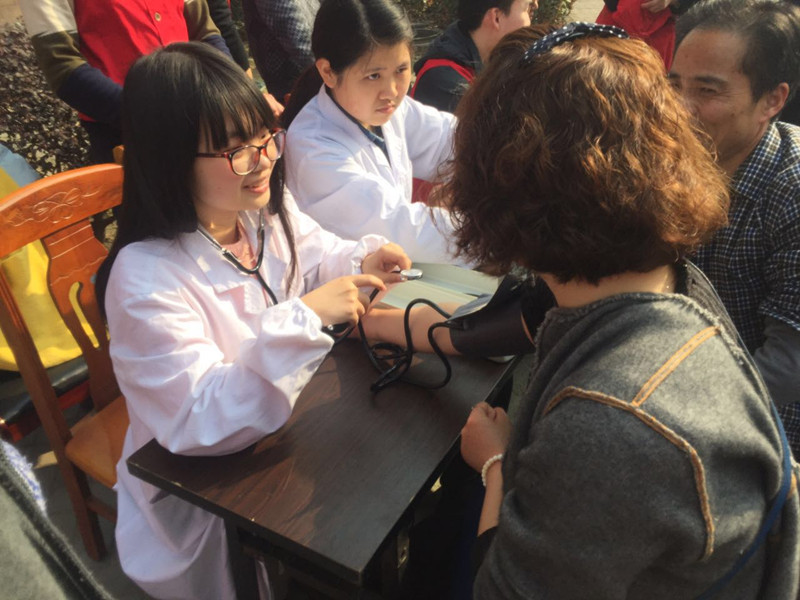与此同时,医学院的志愿者们一行七人来到了紫金港周边的三墩虾龙圩社区,开展“健康进社区”的志愿服务活动。三墩虾龙圩社区里活动着较多中老年人,加之此次活动被安排在社区的主干道上,通过社区工作人员的介绍和受服务人群的宣传,志愿者们刚刚摆开基本的设备,就很快被爷爷奶奶们围了起来,咨询健康知识、接受免费量血压服务的人群络绎不绝。除了基础的知识宣传和量血压外,志愿者还会与社区民众聊聊家常,希望能够用志愿者的青春活力去感染老人,让他们感受到社会的关爱。