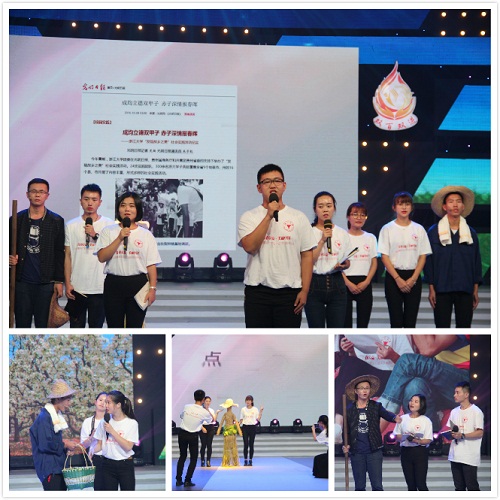 浙江省十佳社会实践团队风采展示的现场,我校农学院的学生们以情景剧的模式生动再现实践场景,将实践成果和点滴感受分为四个篇章向在场的嘉宾及观众们做了精彩展示:“科技支农,智慧入田”、“美丽乡村,助力扶贫”、“点滴汇聚,深入调研”、“播种希望,收获未来”。实践团走访百家贫困农户,调查致贫原因;结合自身专业,帮扶农业发展;规划生态建设,设计旅游方案;传递教育理念,播撒美好希望,以实际行动引领大学生走进乡土乡村,助力精准扶贫。“触摸土地,情系三农,助力扶贫,青春建功!”展示在实践队员们响亮的口号中迎来高潮,实践团以诚挚与热情赢得了经久不息的热烈掌声。