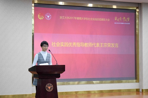 社会实践优秀指导教师代表王宗荣表示,社会实践活动是一种非常好的对学生的思想政治教育方式,非常感谢学校能够给予她这样的机会,对育人工作有了更为深刻的感受和体会。社会实践先进个人代表盛浙同学阐发了自己重走西迁路的感受,“基层是最好的课堂,磨砺是最好的成长。”她表示,浙大学子一定要怀着紧迫感、使命感和责任感,勇敢地接过中国梦的接力棒。