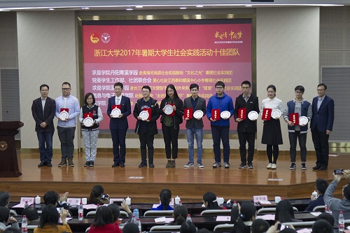 会上,校团委书记沈黎勇宣读了社会实践表彰决定,充分肯定了浙大学子今年暑期社会实践小分队的成绩,宣读了各项荣誉获得者的名单,强调了社会实践在加强和改进大学生思想政治教育工作,激发大学生为国家、社会和学校服务的热情等方面的重要作用,鼓励浙大学子再接再厉、勇立潮头、书写属于求是青年的壮丽篇章。