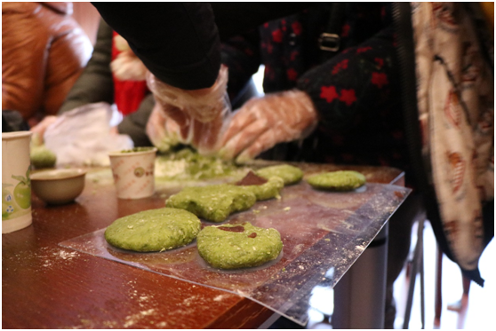 紧接着进入茶饼制作体验环节,和面揉面对于现场有不少精通厨艺的奶奶们来说皆不在话下,而对于还是大一新生的志愿者们显得有些困难。“奶奶,这个要怎么做啊?”“奶奶奶奶,我这儿好像又揉不好了。”几个志愿者小姑娘围着一个手法娴熟的奶奶问了起来。热心肠的奶奶们对志愿者们进行了手把手教学。老人们和青年在对话中彼此熟悉,了解对方的生活。