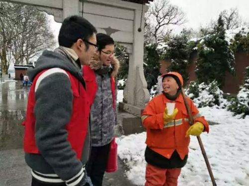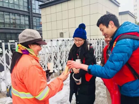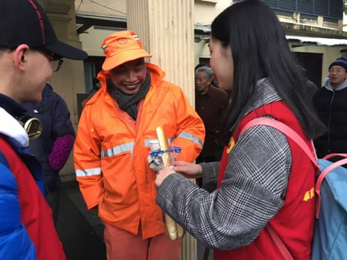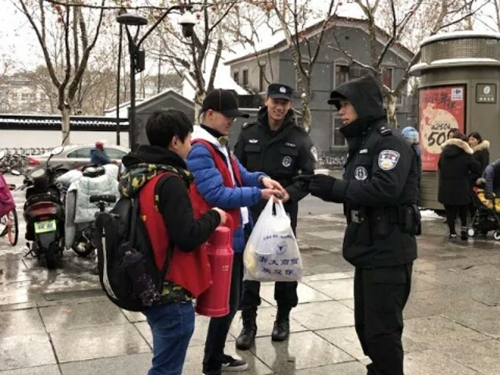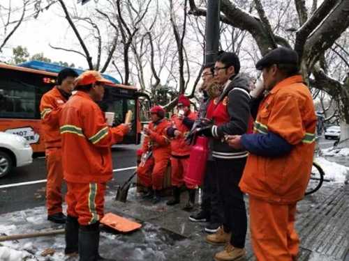 在送温暖的路途上,同学们遇上了两位负责西湖周边治安维护的特警执勤人员。正值两会召开,又逢杭城大雪,两位特警都已在西湖边驻了十余天,每天要在户外连续工作近十小时。当我们问起是否能回家过年时,一位特警摇了摇头,“虽然我是杭州本地人,但年三十那天我会调去灵隐寺执勤,保证敬香祈福群众的安全。”尽管无法和家人团聚,但两位特警脸上还是挂着温和的笑意,端着我们送上的姜茶不住地道谢,当我们拿出准备好的面包时,他们执意推辞,再不肯收,“谢谢同学们了!但这些面包都留着送给环卫工人们吧,他们才是更辛苦的人啊!”