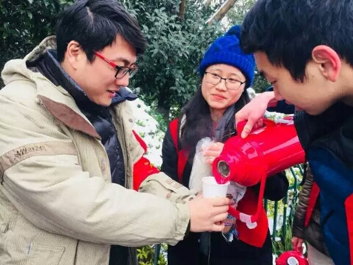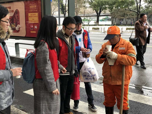 来自校学生会、校青马、校青志以及院系的30余名同学自发带着精心准备的姜茶和糕点,分成7支小分队奔赴杭城的各个角落,向奋战在一线的守护者们送去寒冬里的温暖,聆听他们的心声,表达感谢和敬意。