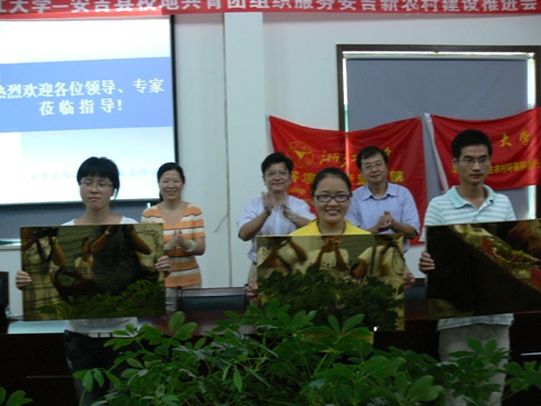 安吉县人民政府县长助理杨京平首先致欢迎词,他代表安吉县委、县政府对郑书记一行的到来表示热烈欢迎。安吉团县委副书记朱书伟介绍了校地共青团组织共建的详细情况和近年来取得的成果。环资学院党委副书记赵朝霞介绍了环资学院在安吉县社会实践开展的总体情况。参加暑期社会实践活动的大学生代表陈星和方舒先后发言,畅谈社会实践给他们带来的收获和感悟,并表示一定会谨遵温总理教诲——在实践中学习、成长。社会实践指导老师石伟勇教授和罗安程教授分别从环境友好型农业技术推广和大学生参加社会实践意义等不同角度作了发言。