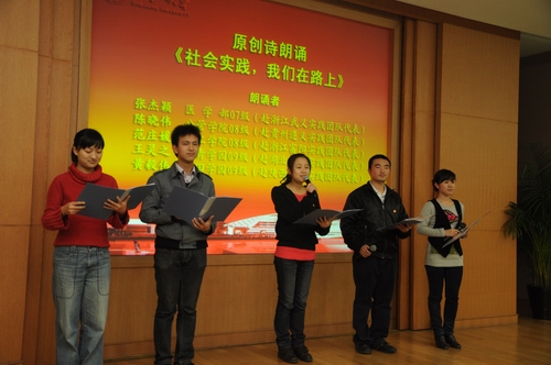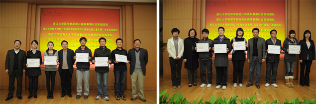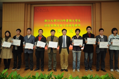 副秘书长、党委办公室、校长办公室叶民主任宣读了浙江大学2010年暑期大学生社会实践表彰文件。郑强副书记为今年暑期社会实践十佳指导教师颁奖。严建华副教务长、叶民副秘书长为获得今年暑期大学生社会实践优秀组织奖的单位颁奖。宣传部部长沈文华,学工部部长金海燕,就业指导与服务中心主任陈谷纲,紫金港校区党工委副书记陈安莉,组织部副部长许翾,研工部部副部长王苑,本科生院教务处副处长金蒙伟为社会实践十佳团队颁奖。