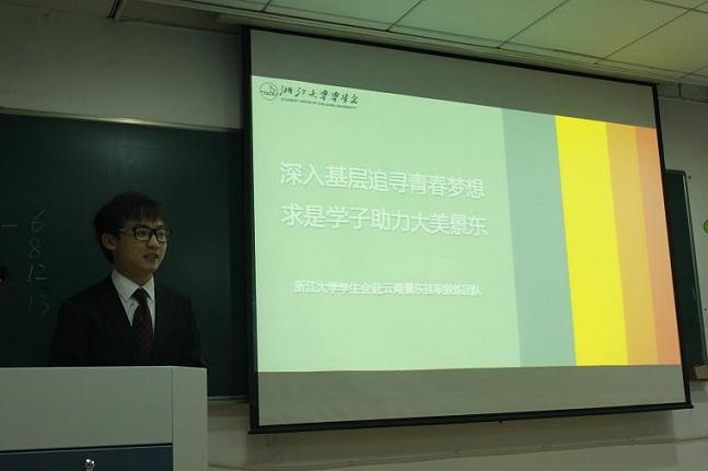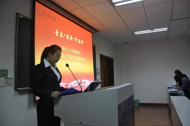10月21日晚,以“青春·使命·中国梦”为主题的浙江大学2013年暑期大学生社会实践活动十佳团队评选答辩会初赛在紫金港校区西区教学楼举行。26支团队在答辩会上进行了精彩的展示。校团委书记刘艳辉、副书记朱佐想,卢军霞、傅慧俊、金敏、郑丹文、蔡荃、吴为进等院系党委副书记出席本次答辩会并担任评委。