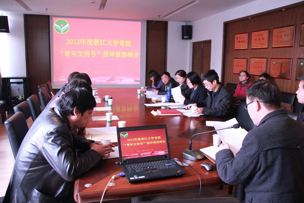 为深入贯彻党的十八大精神,充分发挥校级“青年文明号”集体的积极作用,扎实推进省级“青年文明号”争创工作,2013年12月12日上午,2013年度浙江大学省级“青年文明号”预申报答辩会举行。校团委副书记傅方正、后勤集团党委副书记姜群瑛、计财处副处长胡敏芳、校医院党委副书记缪锋以及各青工单位的团委书记和争创集体负责人出席会议。