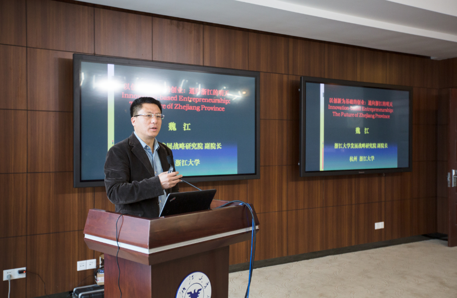 “浙商是浙江最具代表性的特产。在浙江之外的浙商有600万人,包括海外150万人,进行了超过26亿美元的海外投资。”魏江分析的这些关于浙商的数据颇具说服力,他为同学们带来了首场报告会:以创新为基础的创业(IBE)——通向浙江的明天。