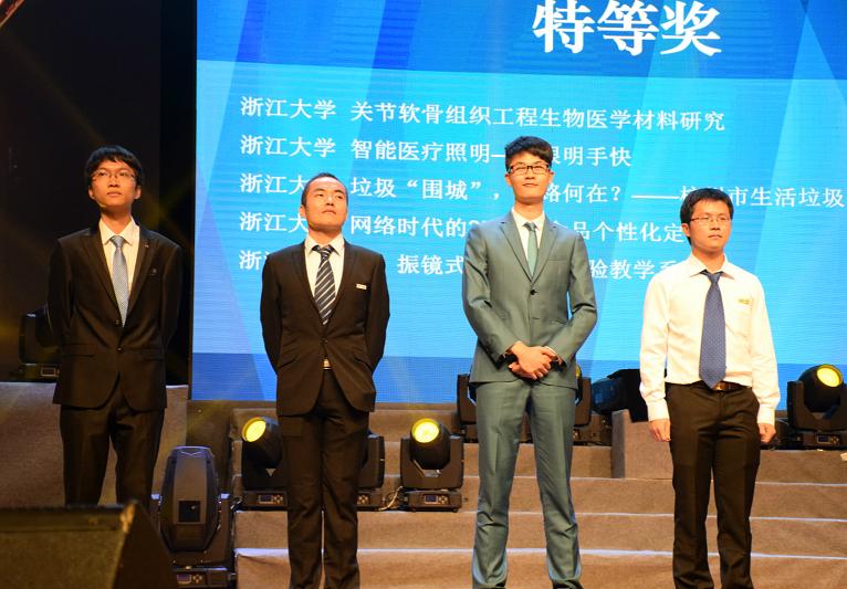 最终我校机械工程学院薛光怀等同学的《网络时代的 3D 打印食品个性化定制》、医学院陈鹏飞等同学的《关节软骨组织工程生物医学材料研究》、光电科学与工程学院申俊飞等同学的《智能医疗照明——眼明手快》和环境与资源学院沈亮等同学的《垃圾“围城”,出路何在?——杭州市生活垃圾分类监管体系研究》等4个项目获得特等奖,经济学院刘雨等同学的《站在“互联网+”的风口上看农产品销售模式创新——“PPOC 农产品网商销售模式”实践研究》等9个项目获得一等奖,建筑工程学院郑宏煜等同学的《消除压倒桥梁的最后一根稻草——面向桥梁安全的自供能超载预警系统》等12个项目获得二等奖。