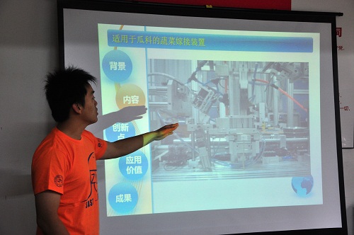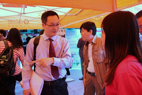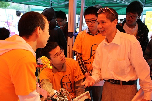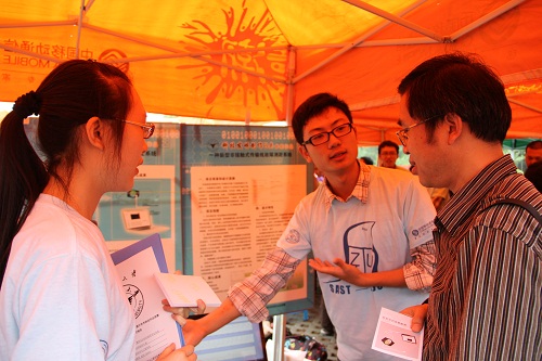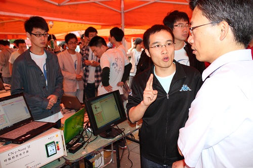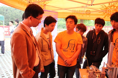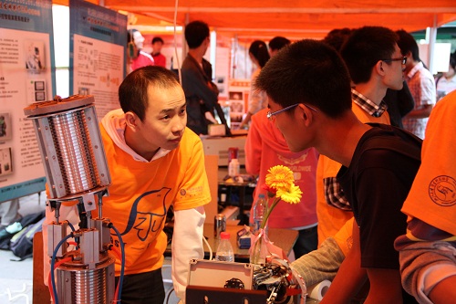 2010年10月正式启动以来,得到了学校党政领导的高度重视、相关工作部门的大力支持和全校师生的广泛参与。经过院级初赛、类别复赛环节,共有58项作品晋级决赛。经过院级初赛、类别复赛和决赛文本评审环节,共有49项作品晋级今天的总决赛。虽然天气不佳,但是决赛的问询会环节还是吸引了很多同学的驻足和关注。身着红、橙、蓝、绿四色参赛服装的参赛选手分别代表社会哲学科学、科技发明A类、科技发明B类以及自然科学类,在各自的展位前以热情饱满的状态为评委、同学讲解各自的作品。相关评委悉心聆听选手们的讲解,并针对作品的先进性、科学性、现实意义等内容与同学们展开讨论,现场气氛浓厚。