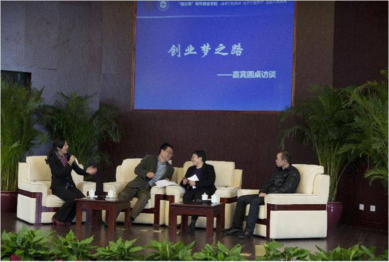 导师聘任仪式后,是在场同学期待已久的“创业梦之路”圆桌访谈。海牛环境科技有限公司的陆侨治先生、浙江大学创业投资有限公司总裁朱国英女士以及浙江大学在读博士生、“蒲公英”学生创业比赛参赛选手毕千同学作为访谈嘉宾,与同学们畅谈自己对创业的理解。作为创业路上的前辈,陆先生和朱女士回顾了自己曲折艰辛的创业历程,对同学们提出了很多中肯的建议。他们指出,大学生一定要了解自己,清楚自己的特长和未来期望;有志于创业的同学,要培养自己的综合能力,要学会建立起至关重要的人脉关系。而毕千同学以一个参赛者和学长的身份,充分肯定了参赛的意义,鼓励大家为自己的创业梦想继续奋斗。三位嘉宾的讲话引起了很多同学的共鸣,并向嘉宾们提出了专业而富有见解的问题,嘉宾们也都结合实际做了富有独创性的回答。