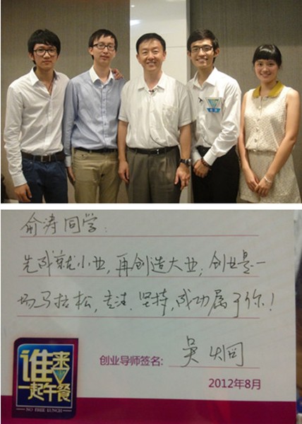 在午餐期间,吴炯先生分享了他在硅谷创业的传奇经历,分析了中美创业环境的差异,期待中国能出现像乔布斯、扎克伯格这类技术和营销意识兼备的创业人才。“先成就小业,再创造大业;创业是一场马拉松,专注、坚持,成功属于你们。”吴炯先生这样鼓励浙大“卡易”学生创业团队的成员们。