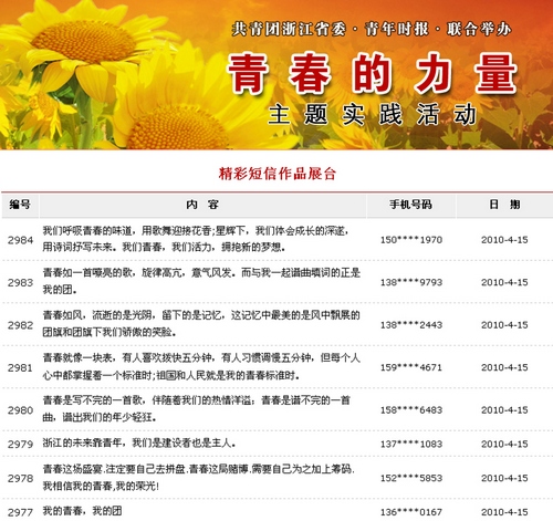 “我的青春·我的团”团员青年短信作品大赛是纪念五四运动91周年活动的重要组成部分。活动以亲身体验为途径,以手机为活动平台,以表达当代青年肩负的时代使命、责任、作为以及帮助遭遇历史罕见特大旱灾的人民群众解决饮水用水问题作出积极贡献为题材内容,以发展健康向上、充满活力的短信文化为目的,通过充分调动团员青年的积极性,正确引导他们深刻理解和勇于表达自身肩负的时代使命和历史责任,充分激发了广大求是青年以与时代紧密结合的方式展示青春的风采和力量。活动自4月份启动以来,得到了全校各院级单位团委、直属团总支的大力支持,从前期的组织宣传到后期的作品收集整理都显示出浙江大学广大团员青年极高的关注度与参与热情。