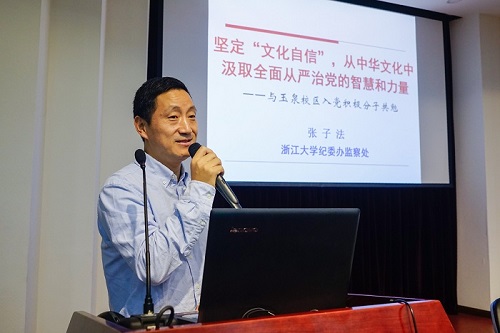 接着,浙江大学马克思主义学院的赵晖老师为学员们带来《党章党史教育》主题报告。赵老师带领大家回顾了党情党史,对党章的发展历程进行了简明扼要的概括,着重介绍了十八大后党章的新特点。赵老师指出,学党章,知党情,我们不仅要了解党的光荣历史,更要从思想上入党,从行为上反映,真正成为一名名副其实的共产党员。赵老师的报告幽默风趣、娓娓道来,援引了不少奇闻轶事,令学员们兴致昂然。
