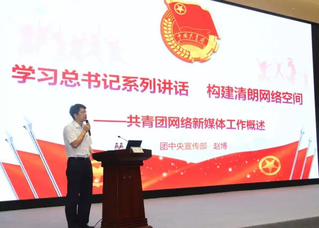赵博作《学习总书记系列讲话 构建清朗网络空间》专题报告。报告由“共青团新媒体工作的背景机遇”“全国新媒体工作总体回顾”“全国大宣传格局构建”和“经验建议”四部分组成。赵博围绕四年里习近平总书记关于做好宣传思想工作的系列讲话,并结合团中央新媒体的大量工作案例,就做好新媒体时代青年人的网络舆论引导工作进行理论指导和经验分享。赵博认为下一阶段共青团的新媒体工作应遵循“阵地建设、队伍建设、领域拓展、产品建设”的思路,做到“敢于亮剑、善于亮剑,时刻保持开放的心态和学习的热情。”