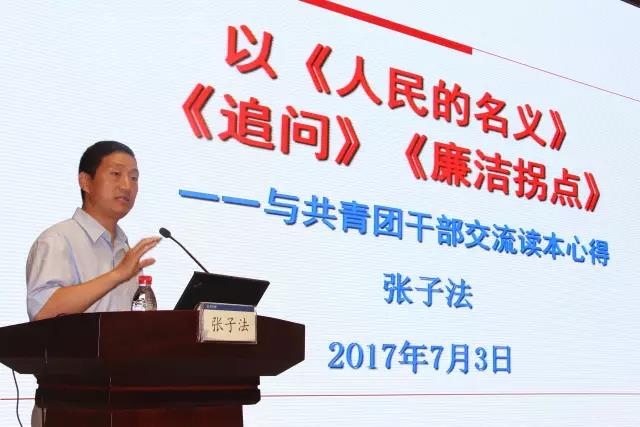 张子法向广大共青团干部作了《以<人民的名义><追问><廉洁拐点>》主题报告。他将《人民的名义》中体现的人物命运以及反映的贪腐问题与当今中国反腐高压下暴露的问题相呼应,发人深省。他强调广大团干要坚定理想信念、坚持党的基本路线、坚决维护党中央权威、严肃党的政治纪律、保持党同人民群众的血肉联系、坚持民主集中制、发扬党内民主和保障党员权利、严格党的组织生活制度、开展批评和自我批评、加强对权力运行的制约和监督、保持清正廉洁的政治本色。