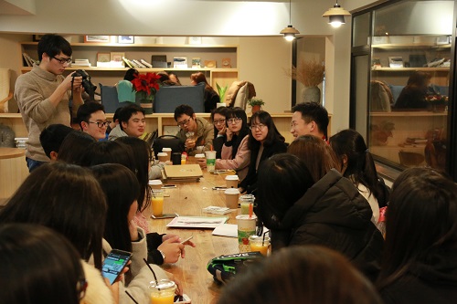 双方首先进行了交流主体的介绍,而后进行了长达两个半小时的座谈。双方你问我答,畅谈甚欢。九十九度的负责人周雨桐为我们介绍了该公众号的创立与发展,诞生于2011年的它致力于挖掘校园新闻和复旦人生活亮点,“新锐、亲切、理性、温和”是它的追求。《复旦人周报》的副主编钟晨洲向我们分享了他们完备的工作体制与理念,坚持纸媒体与开放新媒体的发展历程。混旦负责人黄沈懿向我们展示了复旦民间媒体的崛起与成熟。在讲述所获成就时,双方也就校园媒体竞争力、媒体定位与风格等问题进行了深刻探讨。在感慨复旦同学感性思想与媒体热情之余,同学们此次的复旦行得到更多的是启发与思考。