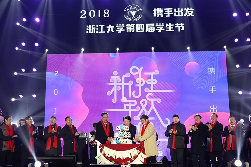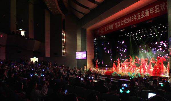 在白天精彩纷呈的各类学生节系列活动结束后,紫云篮球场亮起了炫目的灯光,近6个小时的新年狂欢夜拉开了序幕。百廿辉煌、不忘初心、追逐梦想、携手出发四大表演篇章依次精彩呈现,歌声乐声朗诵声声声悦耳,拉丁古典民俗舞舞姿万千。随着大家“3,2,1——”的倒计时,礼花放飞求是园,怀着期待和祝福,浙大师生一起迎来了新的开始。校党委书记邹晓东、校长吴朝晖、常务副校长任少波、校党委副书记郑强等校领导来到现场与万名浙大学子共度新年。