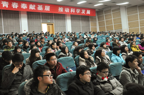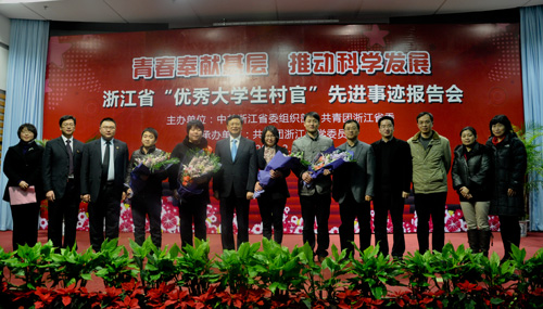 为了弘扬我省“大学生村官”热爱基层、服务农村、扎实工作、甘于奉献的精神,引导全省大学生和“大学生村官”转变就业观念和成才观念,积极投身农村广阔天地,激扬青春,建功立业,加快推进社会主义新农村建设,省委组织部、团省委在评选产生的“十佳百优大学生村官”中组建报告团,举办“优秀大学生村官”先进事迹报告会。2月24日下午,首场报告会在我校紫金港校区临水报告厅举行。浙江省委组织部副部长姚志文、团省委副书记朱斌、浙江大学党委副书记郑强等领导出席报告会,浙江大学、浙江工商大学和杭州电子科技大学的400余名学生代表参加了报告会。报告会由校团委书记刘艳辉主持。