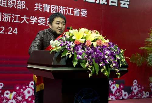 报告会伊始,浙江大学学生代表就向四位报告团成员献上鲜花,表达广大学子对优秀大学生村官的浓浓敬意。