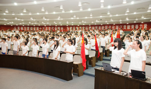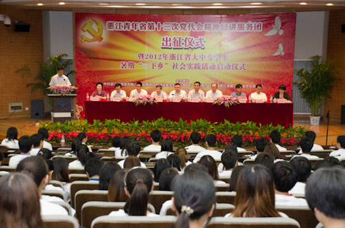 6月20日下午,浙江青年省第十三次党代会精神宣讲服务团出征仪式暨2012年浙江省大中专学生暑期“三下乡”社会实践活动启动仪式在紫金港校区国际会议中心隆重举行。副校长来茂德、团省委副书记朱斌、省委宣传部副巡视员何启明、教育厅副巡视员丁天乐、省文明办未成年人处处长季晓斌、教育厅宣教处副处长吴振辉、校学工部部长金海燕、校团委书记刘艳辉、校宣传部副部长彭凤仪、全国学联副主席、浙江省学联主席苏健出席活动。在杭各高校暑期社会实践团队成员代表近500人参加了本次仪式。活动由团省委常委、学校部部长陈继胜主持。