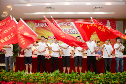 仪式上,领导们为全省“双百双千”党代会精神宣讲服务团队代表授旗。鲜艳的红旗在会场中挥舞,全体学子庄严宣誓,显示出了广大青年参加社会实践红火的热情与坚定的决心。据悉,为深入学习贯彻省第十三次党代会精神,组织引导广大团员青年积极投身社会主义建设,为建设物质富裕精神富有的现代化浙江贡献青春力量,团省委今年将组建100支党代会精神宣讲团和100支文艺服务队,举办1000场形势政策报告会,开展1000场主题团日活动,深入宣传党代会精神,为“建设物质富裕、精神富有的现代化浙江”贡献青春力量。