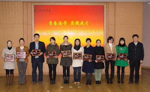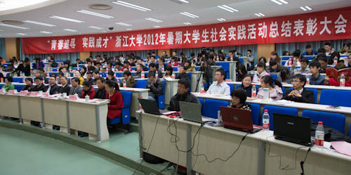 12月7日下午,在全校上下认真学习宣传贯彻党的十八大精神之际,浙江大学2012年暑期大学生社会实践活动总结表彰大会在紫金港校区国际会议中心139室举行。团省委副书记朱斌,校党委副书记任少波,学校相关部门负责人,院系分管领导以及师生代表共计二百三十余人参加了活动。