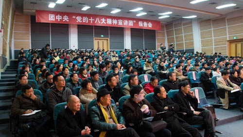 在全校掀起学习宣传贯彻十八大精神热潮之际,12月19日下午,团中央“党的十八大精神宣讲团”报告会在紫金港校区临水报告厅举行。中共中央党校党史教研部副主任谢春涛教授为在杭高校大学生作十八大精神宣讲专题报告。团中央宣传部理论宣传处张健为,团省委常委、宣传部长杜作锋出席报告会。浙江大学党的十八大精神宣讲团成员、各院级党组织分管宣传思想文化工作的负责人、全体团干部、专兼职辅导员、学生骨干及在杭高校学生代表四百五十余人参加报告会。会议由校团委书记刘艳辉主持。校党委宣传部部长沈文华致欢迎辞。