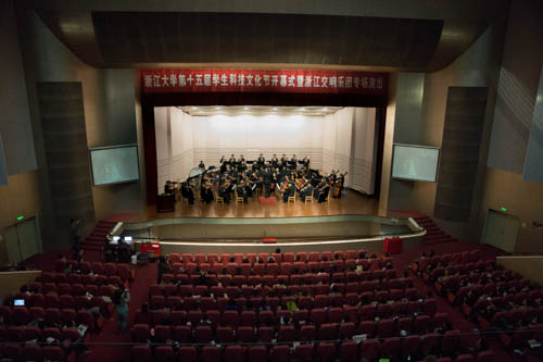 为进一步贯彻落实党的十八大精神和两会精神,提升求是学子的科技创新素质和文化素养,推动校园文化建设,4月22日晚,浙江大学第十五届学生科技文化节开幕式暨浙江交响乐团专场演出在紫金港校区剧场隆重举行。浙江大学党委常委、副教务长严建华教授出席活动并讲话。两办、党委宣传部、学工部、研工部、机关党委、本科生院、校团委、公共体育与艺术部等部门领导出席活动。全校师生代表八百余人观看了演出。