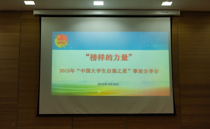 3月30日下午,由浙江大学校团委主办的“榜样的力量”系列专场活动第一场报告会——2015年度“中国大学生自强之星”事迹分享会在紫金港校区安中多功能厅隆重举行。本次会议邀请到2015年度“中国大学生自强之星标兵”荣誉获得者刘丽雅、“中国大学生自强之星”提名奖获得者冯耀耀作为嘉宾分享他们的先进事迹。校团委老师、全校各院系学生代表、国防生代表参加了事迹分享会。