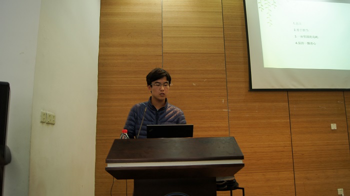 来自数学科学学院的冯耀耀同学以“天行健,君子以自强不息”开始了自己的报告,行走在“自强之星”的道路上,他认为最重要的有四点:自立、勇于担当、做一座坚固的岛屿、保持一颗善心。从参加学校的勤工助学到第一次以班长的身份主持班会、从参加丹青学园的自强自立训练营到第一次当选社团社长、从参加丹青自强之星评选活动到第一次做兼职数学老师,来回骑行十二公里,从绘画作品投稿到期刊网站获得二等奖到校园创业项目推广获得竺院一等奖,丹青重点项目,校级国创项目,冯耀耀用自己的经历告诉在座的同学们面对困难与挑战,要勇于担当,挑战亦是机会,战胜了挑战,才能赢得机会。饮水思源,冯耀耀的成长得到了社会的关心和帮助,如今,他保持一颗善心,他志愿公益,时常对需要帮助的人伸出援手,不忘社会对自己的恩情。去过人民医院做过志愿者去过两所小学三次支教、辅导过两次后勤工作人员子女、辅导过一学年韩国留学生数学、拜访过一次退休老教师、去浙江省博物馆做过志愿等。保持一颗善心,是冯耀耀给同学们朴实而真挚的建议。