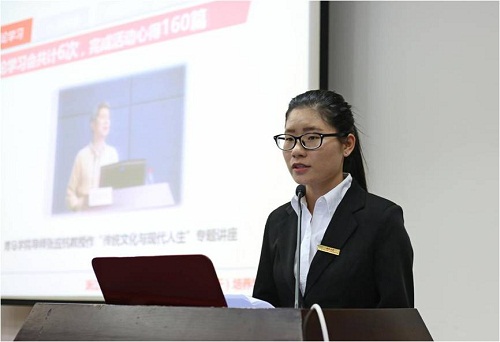 第八期优秀学员代表杨枝柳同学作了总结汇报。杨枝柳同学用一系列数字和成果回顾了第八期青马学员开展的理论学习、“小马悦读”、实践锻炼、参观交流与课题调研等活动,并从信念弥坚、志向弥坚和友情弥坚三个角度谈到了自己在青马这一年的经历、感受与收获。