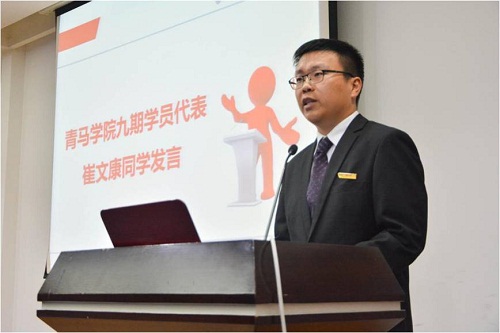 崔文康同学作为青马学院第九期学员代表进行了发言,他从为什么加入青马,什么是青马以及在青马做什么三个方面出发,结合勤学、修德、明辨、笃实的浙江大学价值观,提出了自己在青马对于未来的期许。