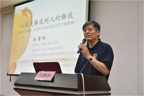 随后,余潇枫教授为同学们带来了题为《从制度解放到人的解放》的专题报告会。他用幽默风趣又发人深省的语言,为大家介绍了马克思与马克思主义,并鼓励大学生培养批判的思维能力,全面提升自己的看待客观世界的理念,拥有更为远大的目标与理想抱负。