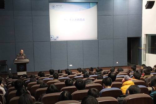 姚先国老师分别从十八大热点,政治体制改革,转型发展,如何看待当前经济形势,人才聚集于创新发展,政府转型等几个方面对十八大以后我国面临的发展机遇和难题做了深入细致的分析。十八大提出了“五位一体”建设社会主义的总体布局,是我国中国特色社会主义理论的一大创新。我国在全面建成社会主义的进程中,充满机遇,但是在政府与市场,经济发展模式,政治体制改革等方面,还面临诸多难以化解的难题。面对这些难题,姚老师提出现行的经济模式难以为继,经济转型必要而紧迫,人才和创新是经济转型的重要动力,政府自身的改革和转型是经济社会转型的关键。姚老师的讲课旁征博引,生动风趣,不时引得满堂欢笑。
