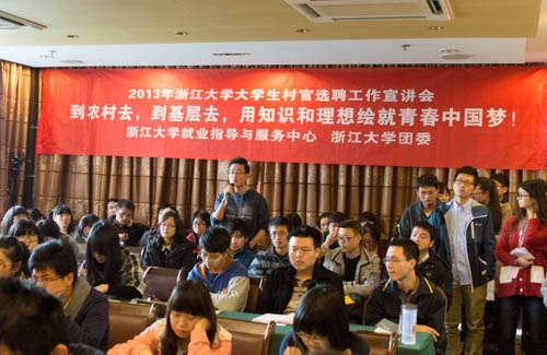 为宣传和解读2013年浙江省大学生村官择优选聘的相关政策,动员和鼓励我校广大热爱基层工作、热心农村事业、吃苦耐劳、乐于奉献、有志于服务新农村建设的应届优秀毕业生投身基层,担任大学生村官,3月28日下午,浙江大学2013年大学生村官政策宣讲会在蒙民伟楼举行。本次宣讲会由校就业指导与服务中心、校团委主办,校就业指导与服务中心主任陈谷纲、校团委书记刘艳辉出席活动,近百名同学参加了宣讲会。