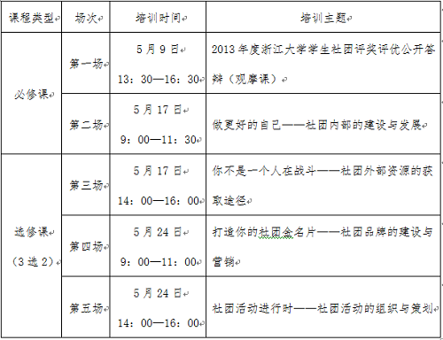1、本次培训共由两个部分组成,其中必修课部分必须参加,选修课部分可以根据自身兴趣与时间选择两场参加,即原则上每位拟任学生社团负责人必须参加4场培训,每场记20分,缺席不得分。