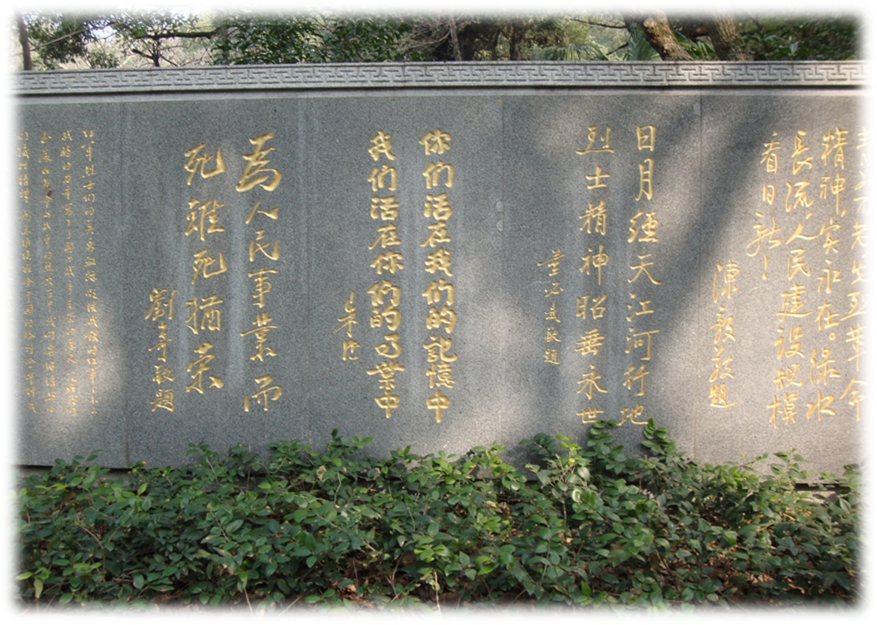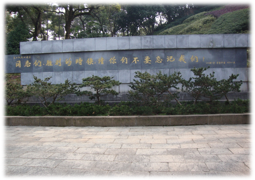 天气萧肃,云居山上郁郁葱葱的树木隔断了城市喧嚣,铺垫渲染出一片庄严肃穆。虽然此次走访适逢纪念馆还在修建期,我们未能进入正式的展厅,但是仅仅通过那一篇又一篇碑文的阅览,已使我内心不禁热血沸腾,百感交加。处于当时那样一个被枪林弹雨充斥的动荡年代,无畏的中国劳苦大众想的不是明哲保身、苟延残喘,却仍旧是那般浩然正气、坚强不屈。面对敌人侵略带来的生离死别,中国人能如此坦荡从容、慷慨赴死。面对多年战乱带来的饥寒交迫,中国人体现出的同胞间的患难友情和大爱精神,让全世界为之动容。这一切的一切都表明了当时是一个真正英雄辈出的时代。真正的英雄,并不一定要像当年曹操那样叱咤风云、为万人所瞩目。反而像革命抗战年代那种能为整个国家,民族牺牲小我的万千平明百姓更是我们应该予以尊敬和缅怀的无名英雄。曹操,一代枭雄,运筹帷幄、破釜沉舟,说到底,为的还是那万人之上、唯我独尊的皇帝宝座。为一己私欲,脚踏万千头颅,手沾亿万鲜血,实在算不得真正的英雄!而在这长达百余年的轰轰烈烈的革命运动中,中国人民为能够探求出一条光明的道路,付出了多大的代价又有哪种仪器可以精确度量。这远不是那几个为人所知的人的抗争,而是数代人坚持不懈的努力。虽然他们的方法各异,康有为、梁启超寄希望于光绪帝的维新变法,孙中山想通过较为和平的资产阶级革命,而毛泽东则寻求于暴力抗争的无产阶级斗争……他们有的成功了,但大多数却失败了。不过,正是这一次又一次的失败才孕育出最终的成功。我们记住了成功者,但同样地,我们也无法忘却那些失败的努力。