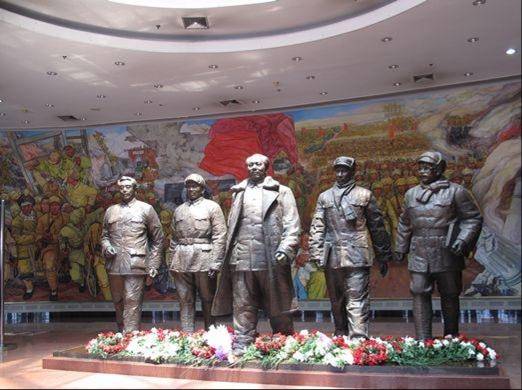迈步走进纪念馆,五位伟人的铜像微笑着向我们挥手。毛泽东、周恩来、朱德、刘少奇、任弼时,是他们领导了解放战争,是他们英明的决策解放了中国,也开创了历史。环绕门厅的壁画《胜利交响诗》用天津杨柳青年画的手法,描绘了平津战役的伟大胜利,歌颂了英勇的解放军战士和支前人民,也仿佛把我们带回了那个战火纷飞的年代。