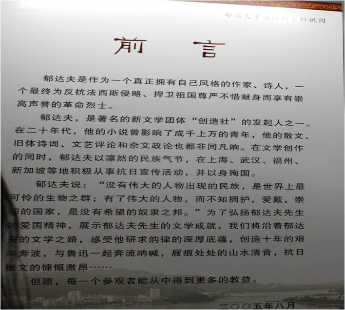 将要离开陈列室的时候,我们感觉到爱国主义完全是可以具体的,像郁达夫先生这样的爱国志士是任何人都可以做到的。郁达夫先生这样许许多多的爱国志士就是具体多面、真切真实、敢言敢干、负有理想的现实个体。