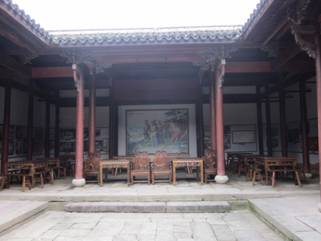 红色的梁柱、黑色的瓦,还有红色的戏台、粟裕的办公间等等,面积不大,但当我们走在它每一寸的石板地上、用手触摸着它的每一寸墙壁时,一种莫名的敬仰与感慨强烈涌上心头,这让我们更加想了解这里所发生的历史。老人带领我们走进这座古色古香的政府旧址,他缓缓移步,每走到一个有史可循之处便驻停下来,动情地为我们讲解那其中的历史渊源。年过八十的老人吐字清晰,步履矫健,看得出来,他很是为自己生在这样一个红色古镇而自豪。这里的墙上还依次钉着后来人们专门制作的宣传画,一幅一幅,我们都一一细读,一一回味其中的革命历史,耳旁,仿佛有阵阵枪声隆隆传来……老人同时也耐心地向我们介绍了当年发生的激烈战斗,这其中最著名的是在位于王村口西南的白鹤尖山上的白鹤尖红军亭发生的战事: 1935年10月,洪家云率领三团攻下了白鹤尖,一举歼灭了敌人保安团等八连,解放了王村口,将王村口人民从水深火热中解救了出来。这以后,红军又在白鹤尖建筑工事,加固防守。也就是在这一年,粟裕将军同样在这里,亲自指挥战斗,一举打垮了国民党军队。为了让后人永远记住红军的丰功伟绩,1985年,这里建立了八角亭,取名为“红军亭”。我们听着老人向我们款款道来,也感受到了老人那种发自内心最深处的用心和对历史的尊重。
