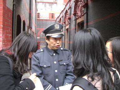 在一大会址纪念馆那典型的上海石库门楼房的门口,一位已顶着白发的保卫人员吸引了我们的注意力,他面容俨然,仿若保卫着那一方神圣土地的卫士。尽管寒风不近人情地一直呼啸,他还是面带微笑,笑迎来者,笑送每一个接受过纪念馆洗礼过的访客,沧桑的脸上的是满足,是幸福,更是一种能够守卫这一方净土的自豪。