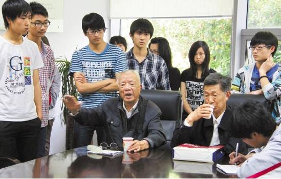 张钦增(中)、尤长保(右三)向大家讲述解放一江山岛的故事。本报记者 吴中平摄
