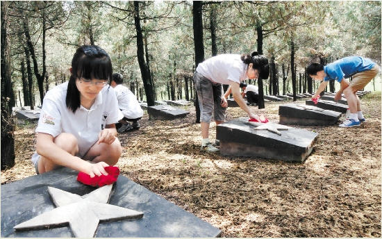 山东临沂孟良崮,浙大寻访队员正在擦拭烈士墓碑。