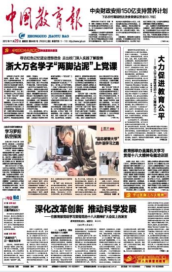 编者按:正当全校上下掀起学习十八大精神热潮之际,在11月29日发行的《中国教育报》头版头条“学习贯彻十八大精神 来自基层的报道”栏目中,以《寻访红色记忆坚定理想信念 走出校门深入实践了解国情——浙大万名学子“两脚沾泥”上党课》为题深入报道我校大学生“红色寻访”主题教育活动,充分肯定我校在实践中总结出的对青年大学生进行社会主义核心价值观教育的创新模式。人民网、新华网等网络媒体进行了转载,教育部网站在“媒体聚焦”栏目进行重点关注。