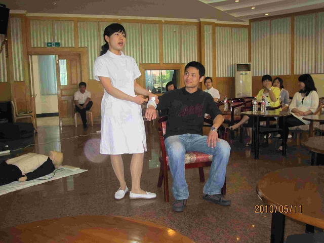 接着培训讲座马上开始。此次培训讲座由杭州市红十字会医院重症监护室叶溪茜护士主讲,护士长韦晓君、主管护师郁国芬、护士张庆男协助进行现场演示和操作。